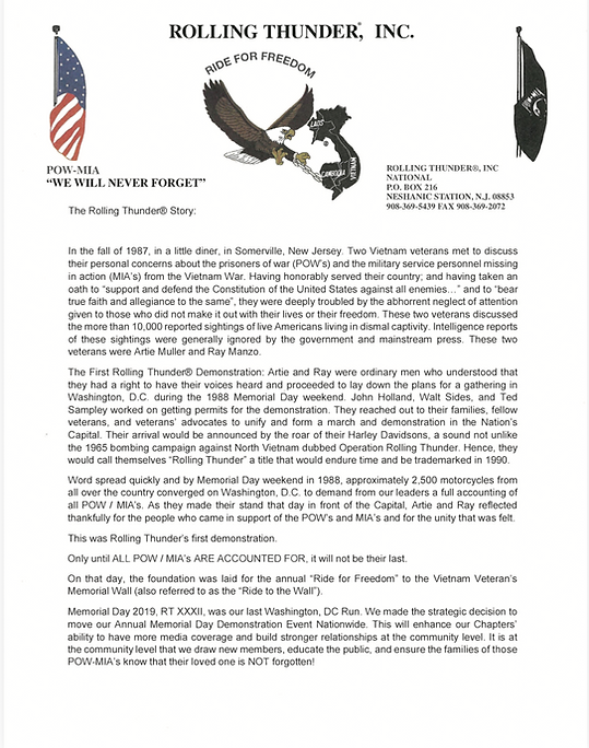 Rolling Thunder®, Inc.'s primary mission is to publicize the POW-MIA issue, educating the public that many American Prisoners of War/Missing in Action were left behind after all previous wars. The organization aims to ensure the government, media, and public do not forget these soldiers, often using the slogan "We Will Not Forget"